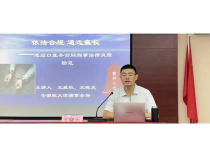 6月27日上午,安徽皖大律師事務所王曉天律師受邀來我司,以“依法合規,通遠贏長——進出口業務合同刑事法律風險防范”為主題開展專題講座。本次講座結合當前外貿行業監管環境,緊扣最新法律法規與典型司法案例,針對簽訂、履行合同失職被騙罪、國有公司企業人員失職罪及國有公司企業人員濫用職權罪三大刑事風險領域展開系統剖析。